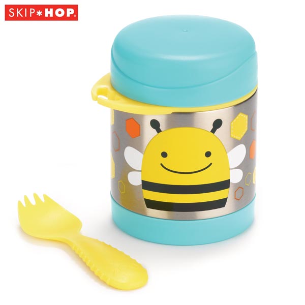 Skip Hopの可愛いアニマル食器シリーズ。 スポーク(スプーン+フォーク!)付きのミツバチ(ビー)のステンレス製フードジャー☆ 外出先でも、保温・保冷効果のあるジャーがあればいつでも出来たてランチ♪ |