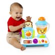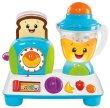 ミキサーの上のオレンジのボタンを押すと、ミキサーが回って光ります。トーストを下に押して、紫のレバーを引くかボールをくるくる回すとトーストが飛び出します。赤いスイッチをスライドさせると愉快な音が鳴ります。