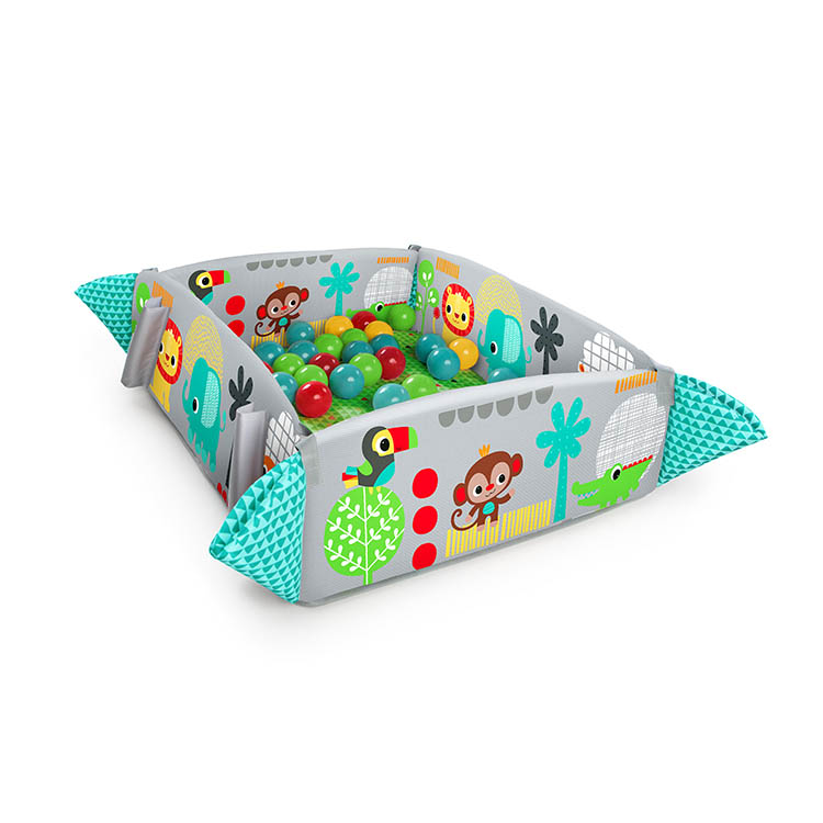 ボールプールとしも使える大きなプレイジム!マットは広げたり、四辺を立ち上げたりすることができ、遊び方に合わせて自由自在。35個のカラフルなボールや、たくさんのおもちゃに赤ちゃんも大喜び!ボール用のバッグもついているので持ち運ぶこともできます。