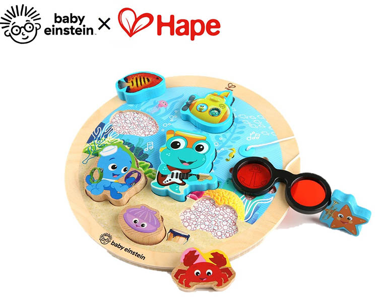 不思議なしかけのある木製パズル。パズルのパーツを外すとモザイク柄が現れ、付属のメガネでのぞくと"何か"が見えます。
